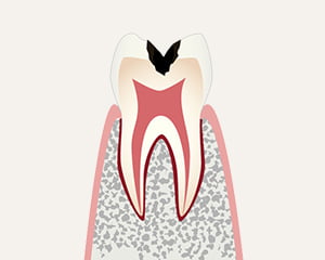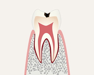 浅い穴が開く段階虫歯が象牙質まで進行し、歯の表面に深い穴が開いた状態です。冷たいものがしみるなど、歯に痛みや違和感が生じます。